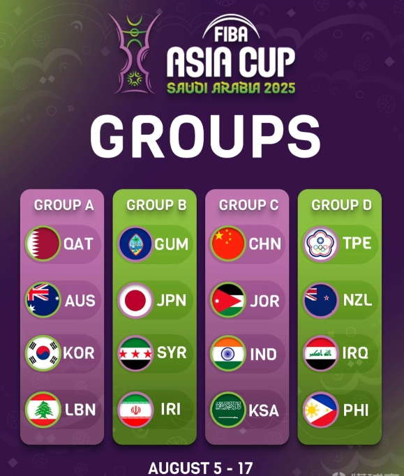 2025男篮亚洲杯将于8月5日至17日在沙特吉达举行。