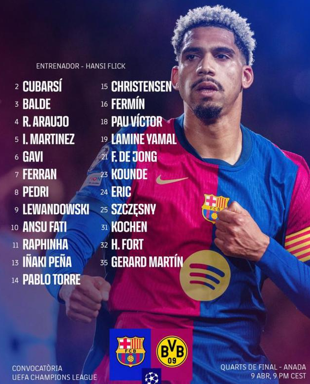 4月9日讯,北京时间明日凌晨,备受瞩目的欧冠1/4决赛首回合即将打响,巴塞罗那将在主场诺坎普球场迎战多特蒙德。赛前,巴萨官方及时公布了本场比赛的球员大名单,引发了球迷们的广泛关注。令人欣喜的是,球队的锋线核心莱万多夫斯基、天才新星亚马尔、进攻利器拉菲尼亚以及潜力后卫库巴西均在列,同时,后防大将伊尼戈·马丁内斯伤愈回归,为球队阵容增添了实力与厚度。