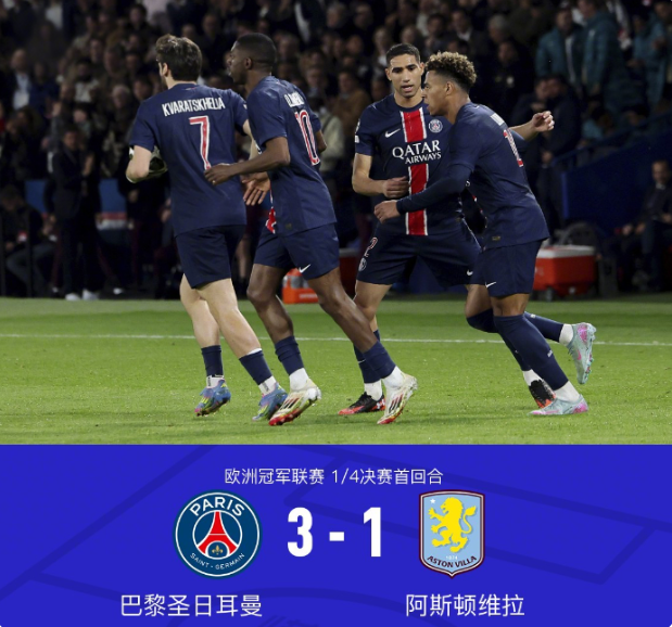 巴黎圣日耳曼同样在欧冠1/4决赛首回合迎来关键之战,对阵阿斯顿维拉。上半场维拉先下一城,随后杜埃轰出世界波扳平。下半场克瓦拉茨赫利亚上演精彩一条龙破门,补时阶段努诺门德斯再入一球,巴黎3-1逆转战胜维拉。尽管维拉门将达米安马丁内斯做出8次扑救,仍未能阻止巴黎赢下比赛,巴黎手握客场进球优势,晋级前景乐观。