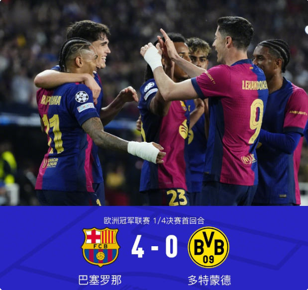 在欧冠1/4决赛首回合中,巴塞罗那主场迎战多特蒙德。巴萨全场攻势猛烈,莱万多夫斯基梅开二度,拉菲尼亚贡献1射2传,亚马尔也取得进球,最终以4-0的大比分完胜多特蒙德。此役巴萨狂轰27脚,完全掌控场上局面,在两回合比赛中基本锁定晋级名额。