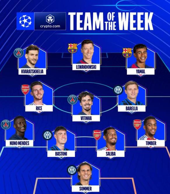 4月10日,欧足联公布本周欧冠赛事最佳阵容。克瓦拉茨赫利亚、莱万多夫斯基与亚马尔领衔锋线,阿森纳中场赖斯入选。