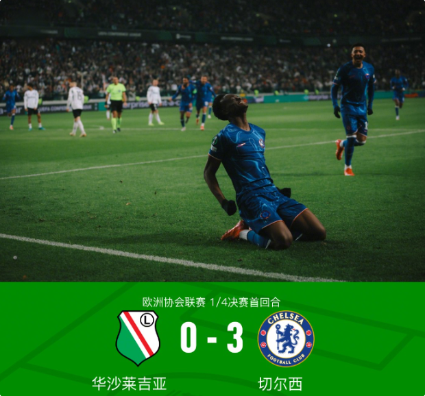 北京时间4月11日,欧洲协会联赛1/4决赛首回合的一场较量拉开帷幕,华沙莱吉亚主场迎来切尔西的挑战。全场比赛切尔西掌控局势,凭借乔治的补射以及马杜埃凯的梅开二度,以3-0的比分战胜华沙莱吉亚,在两回合比赛中占得先机。