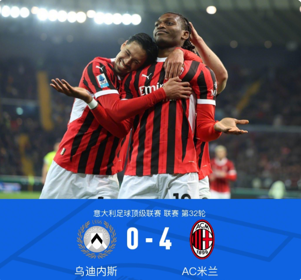 在意大利足球甲级联赛第 32 轮比赛中,AC 米兰客场对阵乌迪内斯。上半场,福法纳助攻莱奥推射破门,随后帕夫洛维奇头球建功,米兰 2-0 领先。下半场,迈尼昂与队友相撞后伤退。特奥在亚伯拉罕助攻下小角度爆射破门,莱奥又助攻赖因德斯撞射得手。最终米兰 4-0 大胜乌迪内斯,取得近 3 轮意甲首胜,球队士气大振,在积分榜上的排名也有望提升。
