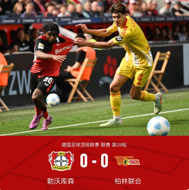 德甲第29轮,勒沃库森主场对阵柏林联合。全场比赛双方进攻乏力,勒沃库森的弗林蓬开场射门造险,希克兜射造险,柏林联也曾有进球但越位无效。下半场,维尔茨伤愈替补登场,但仍未能改写比分,最终双方0-0闷平,勒沃库森在积分榜上的追赶步伐受阻。
