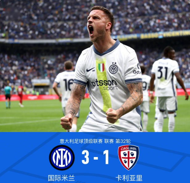 意甲第32轮,国际米兰主场迎战卡利亚里。第13分钟,奥古斯托助攻阿瑙托维奇禁区爆射首开纪录;第26分钟,阿瑙托维奇助攻劳塔罗挑射破门;下半场第48分钟,皮科利为卡利亚里扳回一城;第55分钟,迪马尔科角球助攻比塞克头球破门。国米最终3-1获胜,在少赛一场的情况下,以6分优势领跑意甲积分榜。