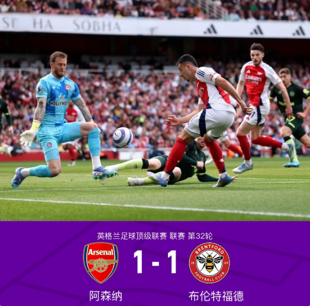 英超第32轮,阿森纳主场对阵布伦特福德。第61分钟,赖斯高速奔袭后分球,帕尔特伊爆射近角破门。但第74分钟,科林斯头球摆渡,维萨转身抽射扳平比分。阿森纳在最近6轮比赛中4次打平,此役过后,在少赛一场的情况下,距离榜首的利物浦有10分差距,争冠形势严峻。