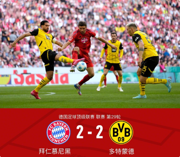 德甲第29轮焦点大战中,拜仁慕尼黑主场迎战多特蒙德。上半场双方均无建树,下半场风云突变。第47分钟,拜尔头球破门助多特蒙德1-0领先。随后格纳布里展现超强个人能力,先是在第65分钟左路突破传中,助攻格雷罗扳平比分;第69分钟,格纳布里一条龙突破抽射破门,助拜仁反超。但第74分钟,吉拉西倒钩打门被扑,安东补射,多特蒙德2-2绝平。此役过后,拜仁仍以6分优势领跑积分榜。