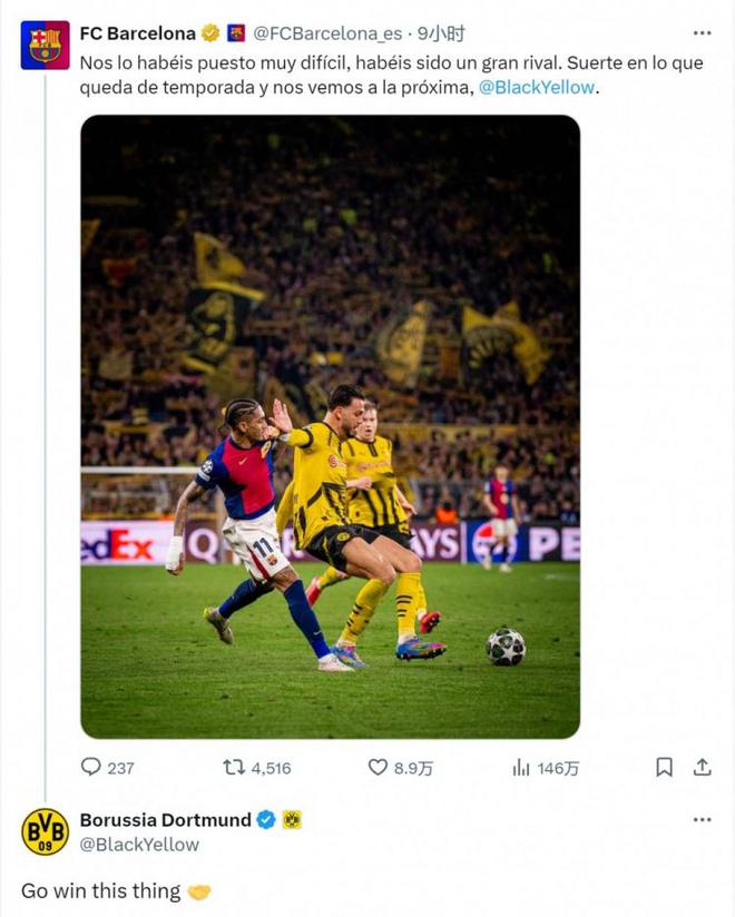 面对巴萨的致敬,多特蒙德官方社交媒体也迅速回应,展现出了体育精神与竞技友谊:“巴塞罗那,去赢得这个冠军吧!”