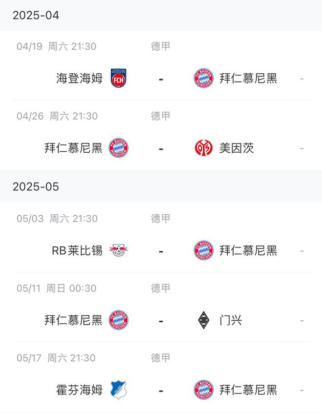 在新世俱杯赛事拉开帷幕前,拜仁本赛季的德甲征程仅余五场硬仗。他们将依次迎战海登海姆、美因茨、莱比锡、门兴以及霍芬海姆。其中,莱比锡与美因茨目前分别占据积分榜第四、第五的位置,实力不容小觑。