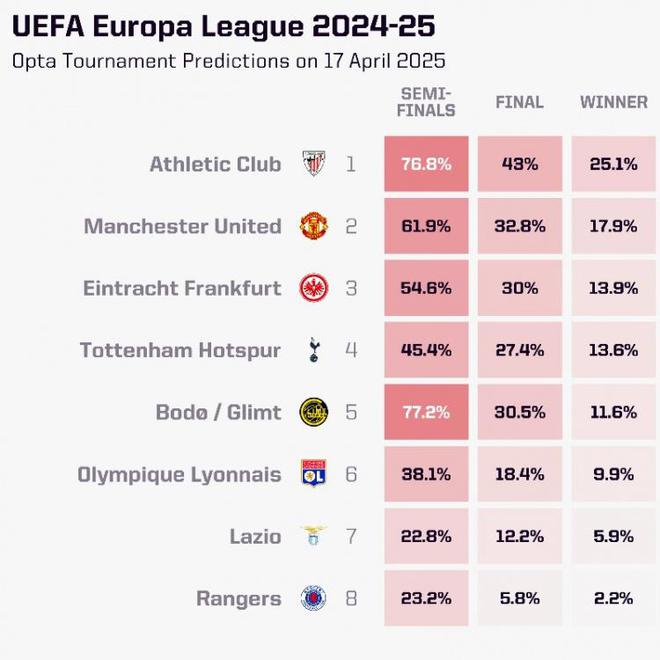 4月17日讯,随着欧联杯1/4决赛次回合的战火即将点燃,知名数据机构Opta通过其超级计算机对各队的夺冠前景进行了深入预测。结果显示,毕尔巴鄂竞技以25.1%的夺冠概率位居榜首,曼联则以17.9%的概率紧随其后。