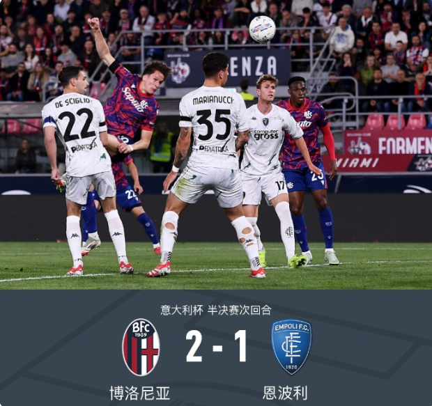 北京时间4月25日,意大利杯半决赛次回合,博洛尼亚与恩波利展开激烈角逐。全场比赛,博洛尼亚的法比安、科瓦连科和达林加分别取得进球,尽管恩波利也有球员破门,但博洛尼亚仍以2-1获胜,两回合总比分5-1淘汰恩波利,成功晋级决赛。
