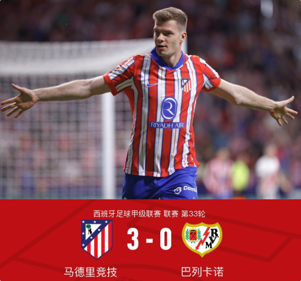 北京时间4月25日,西班牙足球甲级联赛第33轮,马德里竞技在主场迎来与巴列卡诺的对决。全场比赛,马竞的瑟洛特开场闪击破门,加拉格尔和阿尔瓦雷斯(小蜘蛛)也分别建功,最终马德里竞技以3-0的比分战胜巴列卡诺,收获宝贵三分。