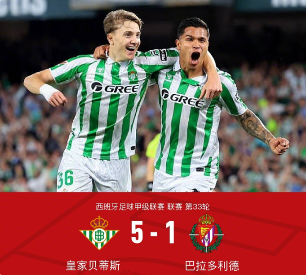 最终,全场比赛结束,皇家贝蒂斯主场5-1战胜巴拉多利德。