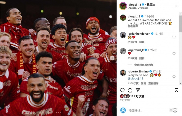 利物浦前锋若塔社媒晒出全队庆祝的合照,配文:“我们做到了!利物浦,这家俱乐部和这座城市……我们是冠军”