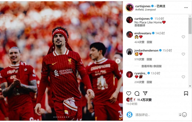 利物浦中场柯蒂斯-琼斯社媒晒出庆祝夺冠的照片,并写道:“没有地方比得上家。”