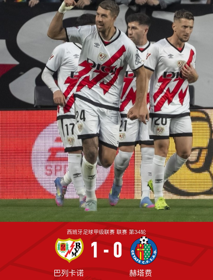 全场比赛结束,巴列卡诺1-0胜赫塔费,送其4连败。