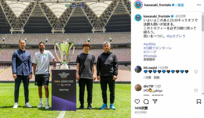5月3日,川崎前锋官方发布重磅照片:亚冠精英联赛决赛双方代表——吉达国民主帅雅斯勒、球星马赫雷斯,以及川崎前锋队长胁坂泰斗、主帅长谷部茂利,一同与冠军奖杯合影。这场将于北京时间5月4日00:30打响的巅峰对决,瞬间点燃球迷期待。