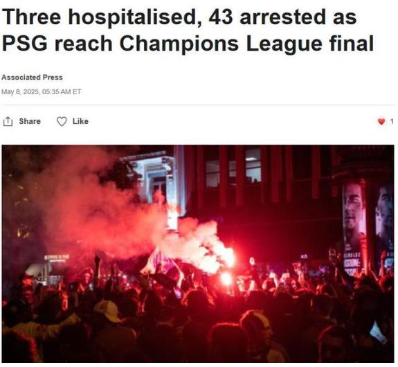 此前,巴黎圣日耳曼在欧冠半决赛次回合中淘汰阿森纳,历史性地第二次闯入欧冠决赛。这本是值得全城欢庆的时刻,然而,巴黎警方透露,庆祝活动期间,全市范围内爆发多起小规模骚乱事件,警方为此采取行动,共逮捕43人。受伤球迷是在著名的香榭丽舍大道附近遭遇汽车撞击,目前事故具体细节仍在深入调查中。