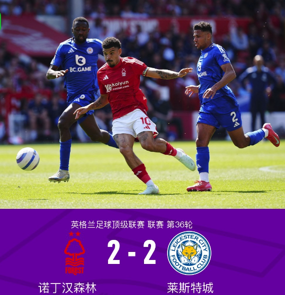 北京时间,英格兰足球顶级联赛第36轮,诺丁汉森林主场对阵莱斯特城,双方奉献了一场精彩的进球大战,最终以2-2的比分握手言和。