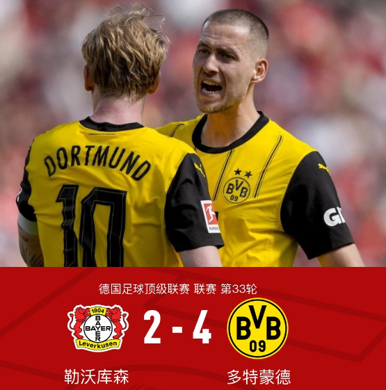 北京时间5月11日21:30,德甲联赛第33轮上演焦点对决,勒沃库森坐镇主场迎战多特蒙德。本场比赛过程跌宕起伏,多特蒙德在一度落后的情况下实现逆转,以4-2战胜勒沃库森,距离前四仅差1分。