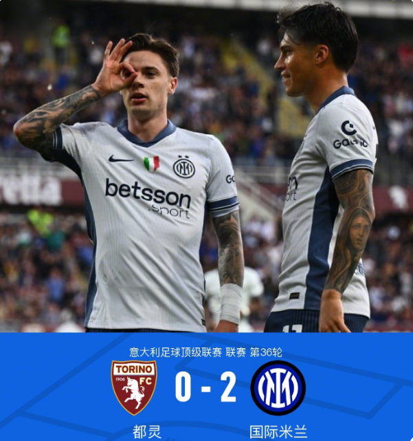 最终,全场比赛结束,都灵0-2负于国际米兰。