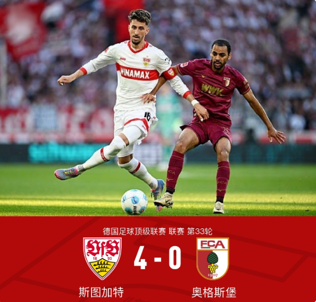 最终,全场比赛结束,斯图加特4-0战胜奥格斯堡。