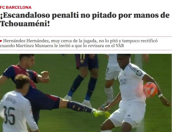 《世体》犀利指出,琼阿梅尼在禁区内的手球动作堪称“证据确凿”——其手臂明显外扩超出身体正常范围,且直接干扰了必进之球的轨迹。更令人费解的是,VAR裁判马丁内斯已向主裁埃尔南德斯提醒这一状况,现场主裁也目睹了全过程,却依然未做出任何判罚。这种无视规则的举动,在赛后引发巨大争议。