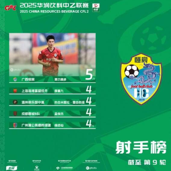 5月14日消息,2025华润饮料中乙联赛战火已燃至第9轮,射手榜竞争激烈,局势渐趋明朗。广西恒宸足球俱乐部的费尔南多表现突出,在第9轮比赛中成功斩获1球,凭借5粒进球的总成绩,在众多射手中脱颖而出,独占射手榜鳌头。