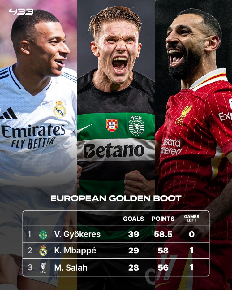 据433报道,姆巴佩和萨拉赫本赛季仍然有机会争夺欧洲金靴。