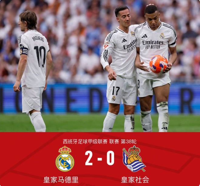 西甲第38轮,皇马主场2-0战胜皇家社会,以联赛第二结束赛季。安切洛蒂迎来执教皇马的告别战,莫德里奇、巴斯克斯完成主场谢幕战。姆巴佩梅开二度成为全场最佳,银河战舰用胜利为赛季画上句号,同时正式开启阿隆索时代的倒计时。