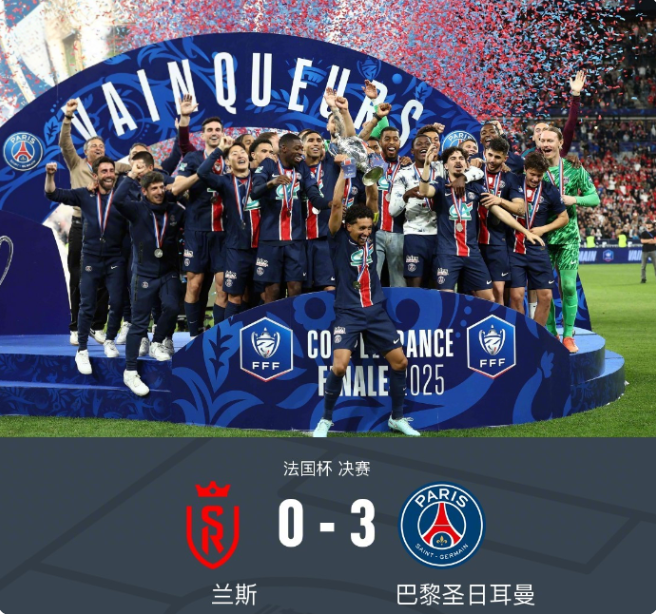 巴黎圣日耳曼在法国杯决赛中3-0轻取兰斯,成功卫冕冠军。巴尔科拉贡献2球1助攻,阿什拉夫破门锦上添花。至此,巴黎本赛季包揽法甲、法国杯、法超杯三座冠军,成为国内赛场绝对霸主。球队下一站将是6月1日的欧冠决赛,力争冲击赛季四冠王。