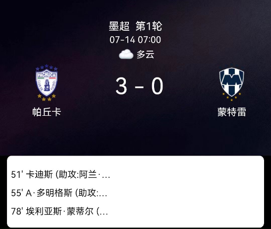 2025年7月14日,墨西哥足球超级联赛春季联赛首轮,帕丘卡主场3-0完胜蒙特雷。卡迪斯首开纪录后助攻多明格斯扩大比分,埃利亚斯-蒙铁尔锁定胜局。帕丘卡凭借高效进攻掌控比赛。