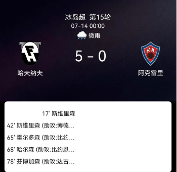 2025年7月14日,冰岛足球超级联赛第15轮,哈夫纳夫约杜尔主场5-0狂胜阿克雷里。斯维里松上演梅开二度,哈尔多尔松、SigurdurBjarturHallsson、K-芬博阿松各入一球