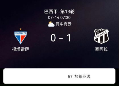 2025年7月14日,巴西足球甲级联赛第13轮焦点战中,塞阿拉客场1-0力克福塔莱萨。全场唯一进球由加莱亚诺在第57分钟打进,塞阿拉凭借此球获得三分,福塔莱萨则遭遇主场两连败。