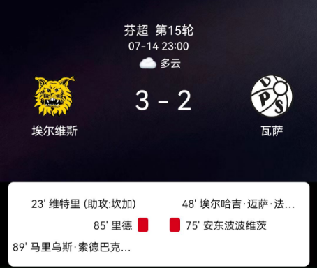 北京时间7月14日,芬兰足球超级联赛第15轮,埃尔维斯坐镇主场迎战瓦萨。上半场,埃尔维斯由贾德尔-康加送出助攻,维特利抓住机会先拔头筹。下半场,瓦萨通过瓦基的助攻由MaissaFall扳平比分。随后,波波维茨不慎自摆乌龙,使瓦萨反超比分。此后,泰勒-里德同样自摆乌龙,将比分再次改写。比赛尾声阶段,阿金耶米送出精妙助攻,瑟德贝克冷静破门锁定胜局。最终全场比赛结束,埃尔维斯以3比2战胜瓦萨。