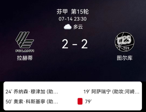 北京时间7月14日,芬兰足球甲级联赛第15轮,拉赫蒂主场迎战TPS图尔库。比赛中,TPS图尔库的AkimSairinen在上半场接队友EmuKawakita助攻率先破门。随后,拉赫蒂由哈萨送出助攻,穆津加扳平比分。易边再战,拉赫蒂球员TobiasKarkulowski助攻科斯基宁反超比分。比赛尾声阶段,EmuKawakita再次送出助攻,AkimSairinen完成梅开二度,将比分最终定格为2-2。