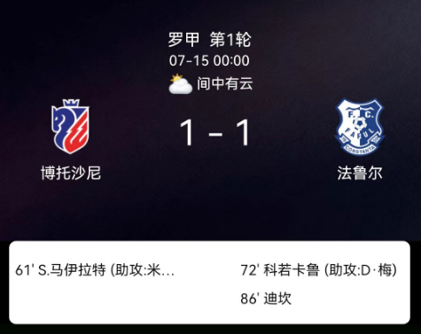 第61分钟:佐兰-米特罗夫左路传中,马伊拉特包抄推射破门,博托沙尼1-0领先。