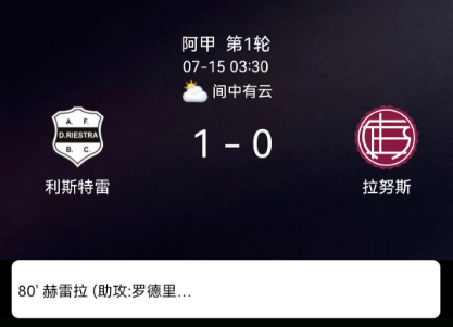 北京时间7月15日阿根廷足球超级联赛秋季联赛第1轮,列斯特拉体育主场对阵拉努斯。列斯特拉体育霍纳坦-埃雷拉破门。最终比分列斯特拉体育1-0拉努斯。