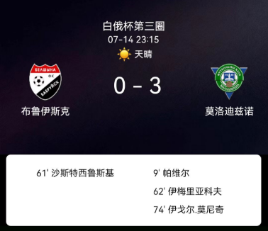 北京时间7月14日白俄罗斯杯第三轮,博布鲁伊斯克对阵莫罗德切诺。莫罗德切诺采斯柳克维奇破门,E.Imeryakov破门,igormonich破门。最终比分博布鲁伊斯克0-3莫罗德切诺。