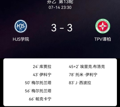 2025年7月14日,芬兰足球乙级联赛B组第13轮,HJS学院主场3-3战平TPV谭柏利。Aleksi-Ikonen先拔头筹,nestori-meltoranta梅开二度,TPV谭柏利由Eric-Bullock、Tomi-Ylinen、Joonatan-Sipola连入三球扳平。HJS学院两人染红导致场面失控,双方最终握手言和。