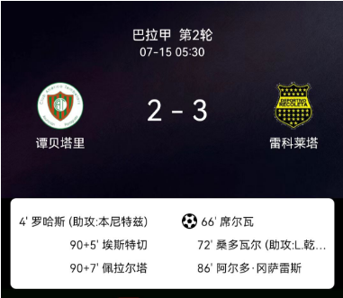 北京时间7月15日巴拉圭足球甲级联赛秋季联赛第2轮,谭贝塔里竞技主场对阵雷科莱塔。谭贝塔里竞技胡安-罗哈斯破门,FranciscoEsteche破门。雷科莱塔亚历杭德罗-席尔瓦破门,乌戈-桑多瓦尔破门,AldoGonzález破门。最终比分谭贝塔里竞技2-3雷科莱塔。
