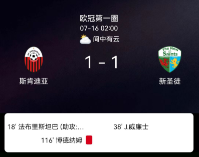 北京时间7月16日,欧洲冠军联赛资格赛第一轮次回合展开角逐,斯肯迪亚迎战新圣徒。比赛中,斯肯迪亚球员坦巴率先打破僵局,为球队取得领先优势。随后,新圣徒球员乔丹-威廉斯成功扳平比分,将比赛拉回均势。最终双方以1比1握手言和,两回合总比分亦为1比1。