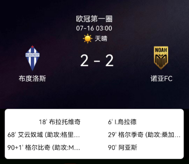 北京时间7月16日欧洲冠军联赛资格赛第一轮次回合,布度洛斯对阵诺亚。布度洛斯伊戈尔-伊万诺维奇破门,佩塔尔-格尔比奇破门。诺亚奥拉德-奥马尔破门,格尔吉奇破门。最终比分布度洛斯2-2诺亚。两回合总比分布度洛斯2-3诺亚。
