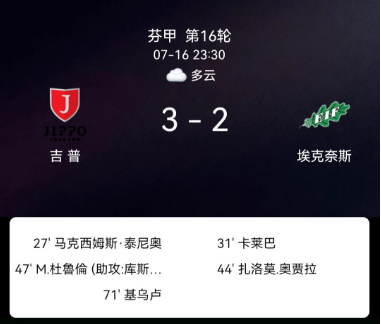 北京时间7月16日,芬兰足球甲级联赛第16轮,吉波坐镇主场迎战EIF埃克纳斯。比赛中,吉波的马克西穆斯-泰尼奥率先打破僵局,随后对手由卡勒巴扳平比分,紧接着奥亚拉再入一球帮助EIF埃克纳斯反超。上半场临近结束前,吉波通过一次精妙配合,由科伊斯蒂宁送出助攻,MiroTurunen推射破门,将比分再度扳平。易边再战,基乌鲁挺身而出,为吉波打入制胜一球。最终,吉波以3比2战胜EIF埃克纳斯,全取三分。