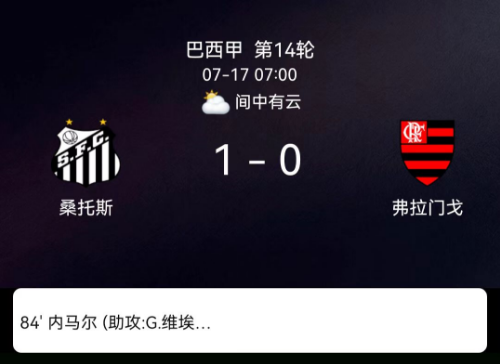 北京时间7月17日,巴西足球甲级联赛第14轮,桑托斯坐镇主场迎战弗拉门戈。比赛进行至第84分钟,吉列尔梅送出助攻,内马尔抓住机会完成破门,帮助球队取得领先。凭借此球,桑托斯以1-0战胜对手,全取三分。