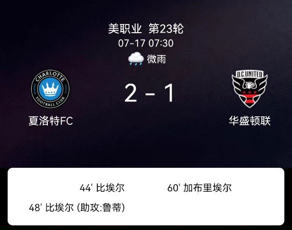 北京时间7月17日美国职业大联盟常规赛,夏洛特主场迎战华盛顿特区联。比赛中,夏洛特球员佩普-别尔表现出色,先是接队友传球破门得分,随后再次攻入一球,完成梅开二度。华盛顿特区联方面,加布里埃尔-皮拉尼在下半场打入一球,为球队扳回一城。最终,夏洛特以2比1战胜华盛顿特区联。