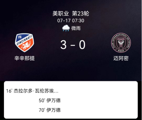 北京时间7月17日美国职业大联盟常规赛,辛辛那提坐镇主场迎战迈阿密国际。比赛中,辛辛那提球员奥雷利亚诺送出助攻,帮助赫拉尔多-巴伦苏埃拉首开纪录。随后,伊万德在上下半场各入一球,完成梅开二度。最终辛辛那提以3比0击败迈阿密国际,全取三分。