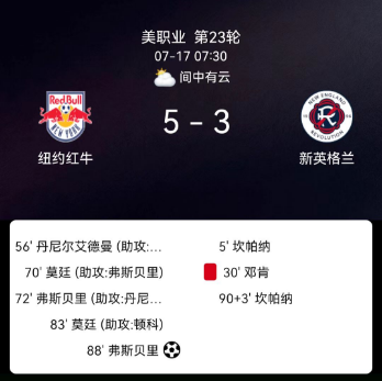北京时间7月17日美国职业大联盟常规赛,纽约红牛主场对阵新英格兰革命。纽约红牛埃德尔曼破门,舒波-莫廷梅开二度,福斯贝里梅开二度,凯尔-邓肯自摆乌龙。新英格兰革命坎帕纳梅开二度。最终比分纽约红牛5-3新英格兰革命。