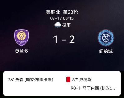 北京时间7月17日美国职业大联盟常规赛,奥兰多城主场对阵纽约城。奥兰多城罗宾-扬松破门,凯尔-史密斯自摆乌龙。纽约城阿德里安-马丁内斯破门。最终比分奥兰多城1-2纽约城。