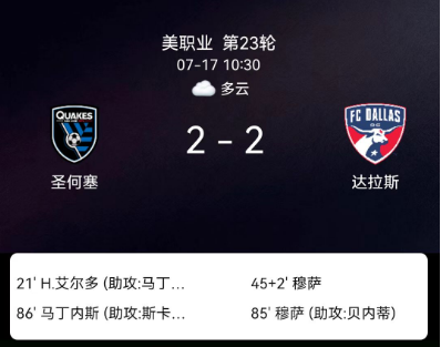 北京时间7月17日美国职业大联盟常规赛,圣何塞地震主场迎战达拉斯。比赛中,圣何塞地震由哈尔克斯和约瑟夫-马丁内斯各入一球,达拉斯方面则凭借穆萨的两粒进球扳平比分。最终双方以2-2握手言和。